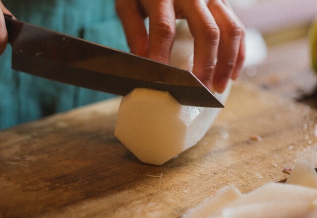 大根とにんじんはイチョウ切りにする。こんにゃくは野菜の大きさにあわせて切ってサッとゆがく。長ねぎは薄い小口切りにする。にんにくは2mmほどの厚さに切る。